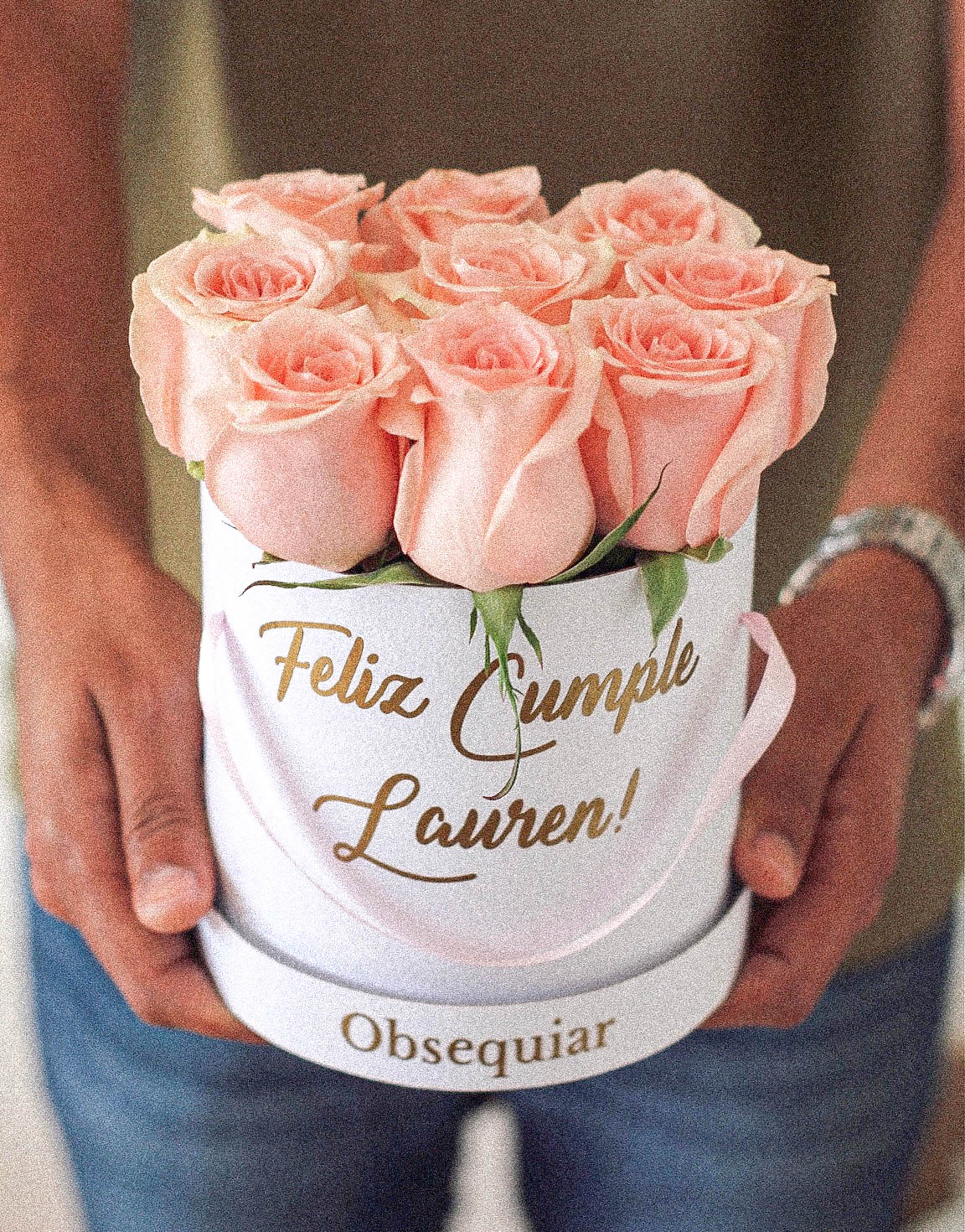 Hermoso arreglo de caja floral blanca redonda, constante de 9 rosas naturales importadas color rosa.