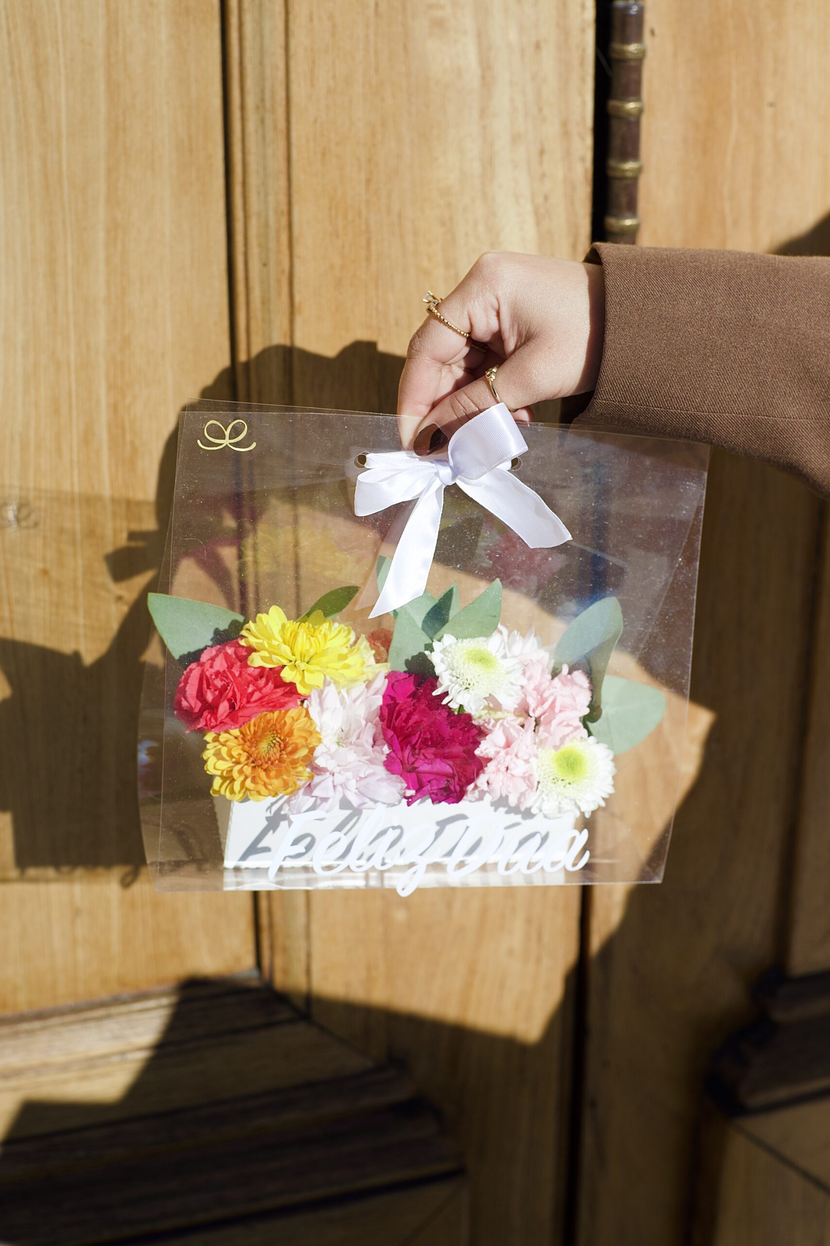 El arreglo se presenta en un bag de acetato transparente que simula el cristal, realzando la belleza natural de cada flor como si estuvieran en una vitrina.